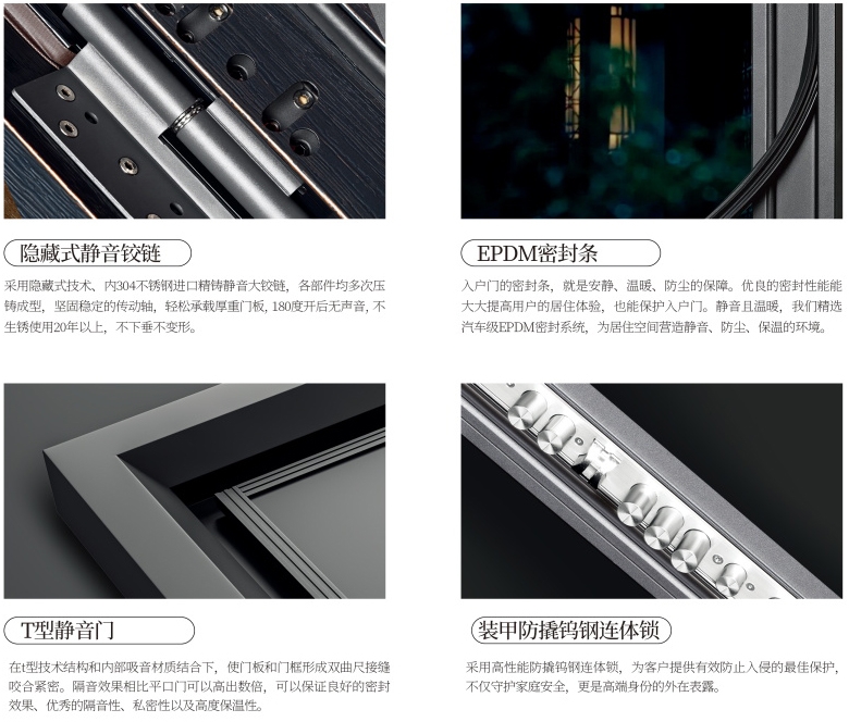 书香门门第洞悉用户需求,从恒温、安全、静音、火阻、水密、抗压等多个维度刷新户门防护性能标准,所有户都按照高气密性标准进行生产、组装和安装,将安全可靠的特质贯穿到户门门的每一个细节以360度全面防护性能给客户满满的安全感。